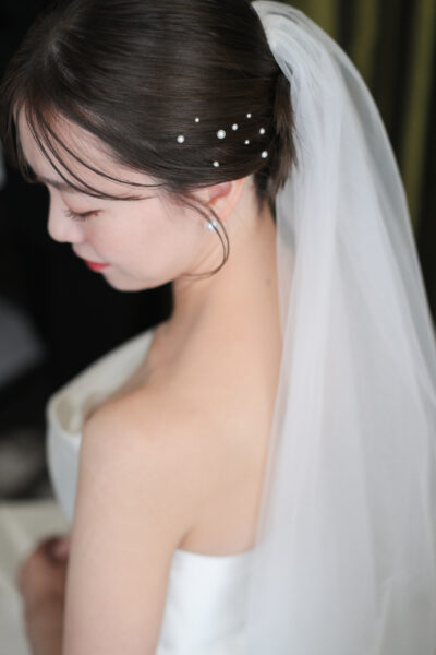 小ぶりなパールをイヤリングとして忍ばせ、ヘッドにはパールシールを付けて…
