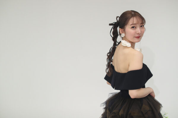 暗い色のベロアリボンをつけて派手過ぎず、それでも女性らしいかわいさたっぷりの印象に