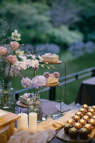 テーマに合わせてデザートの色味・装花を
